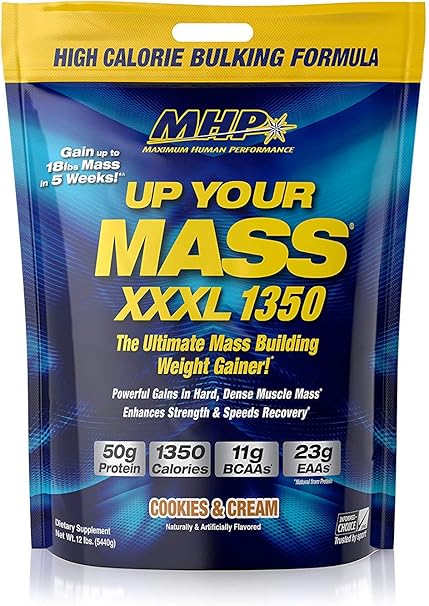 Amazon Com Mhp Uym Xxxl 1350 Mass Building Weight Gainer Muscle Mass Gains W 50g Protein High Calories 11g Bcaas Leucine Cookies Cream 16 Servings Health Personal Care