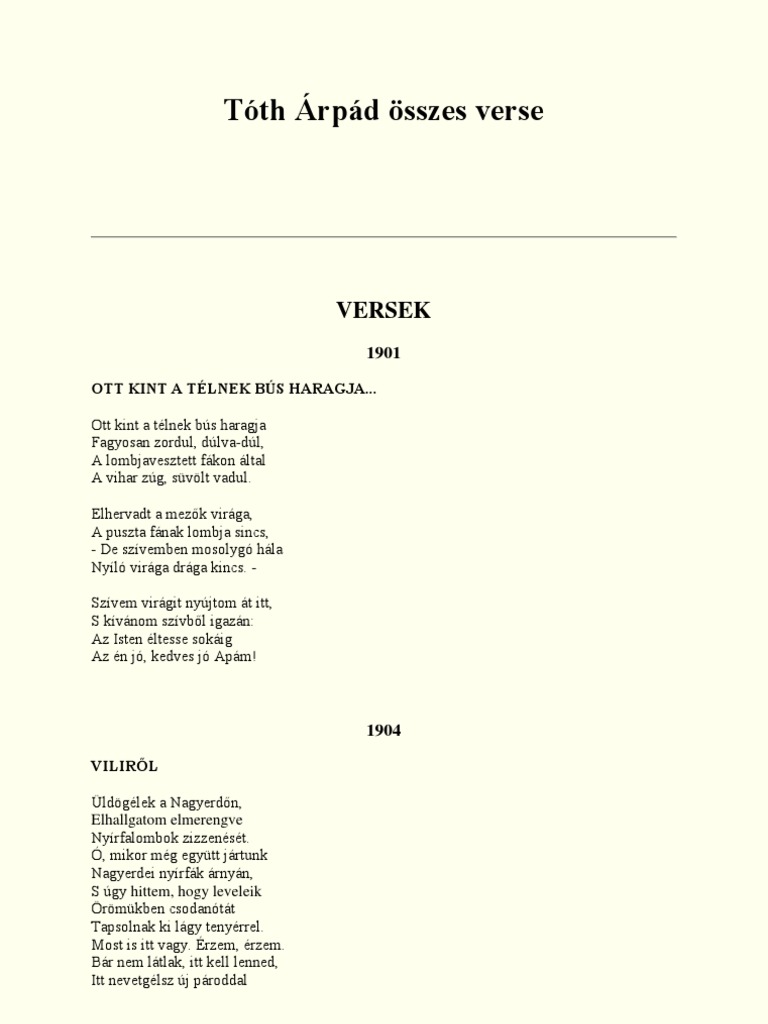 Tóth árpád összes verse. Billió mérföldekről jött e fény jött a jeges fekete és kopár terek sötétjén lankadatlanul s ki tudja mennyi ezredéve. Richárd vasárnap notturno régi dallamok a muhi pusztán a sorbonne halottja csendes már. A válogatásban mint minden lista esetében természetesen elsősorban szubjektív szempontok játszottak közre másrészt igyekeztünk azokat a verseket összegyűjteni amelyek az elmúlt években rendszeresen visszatérő darabjai voltak az olvasói.
